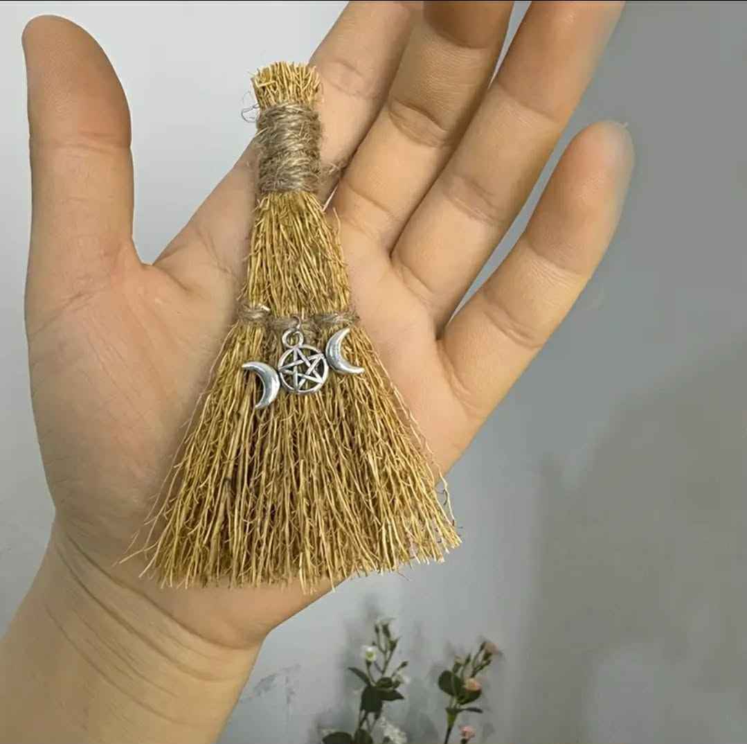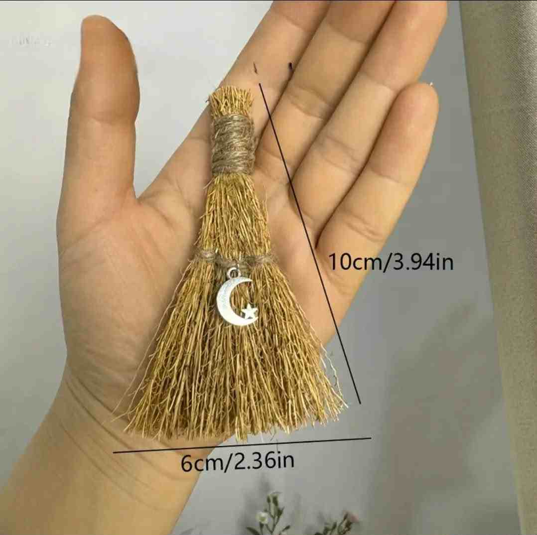 Dekoratyviniai simboliai (pvz., mėnulis, pentagrama, akmenėlis) suteikia šluotelei charakterį ir sustiprina ritualinę nuotaiką. Dėl natūralių medžiagų kiekvienas gaminys gali nežymiai skirtis – tai autentiškumo dalis.