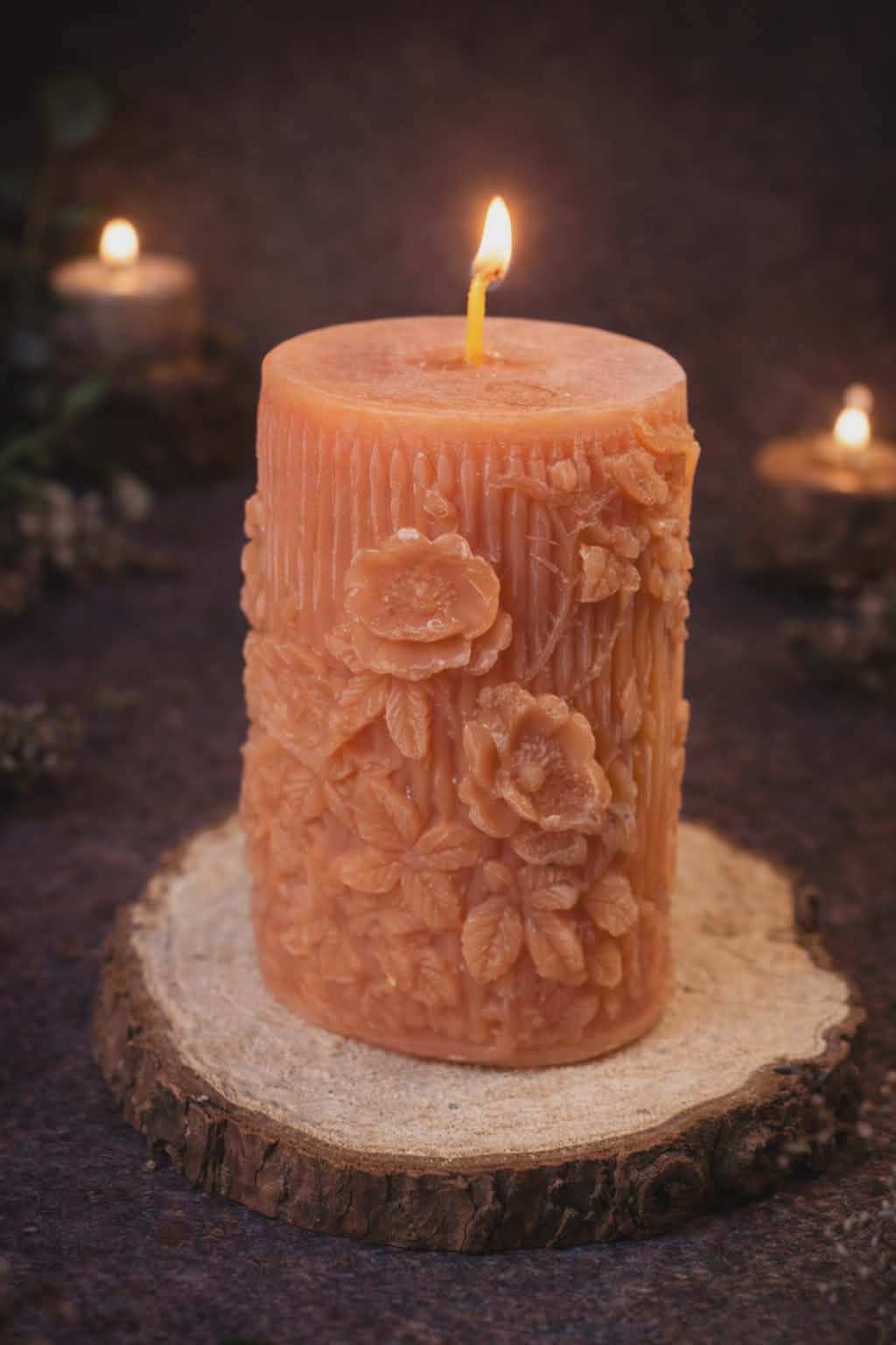 Natūralaus bičių vaško žvakė, skleidžianti šiltą, raminančią šviesą ir namų jaukumą.