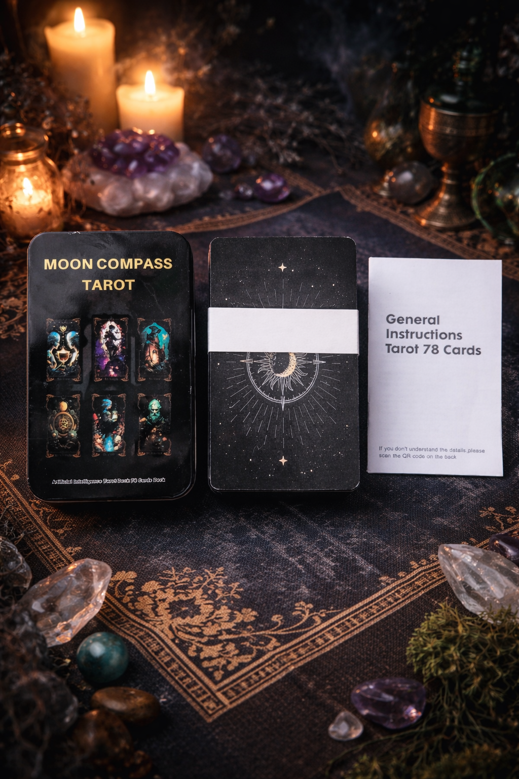 Modernus 78 kortų Tarot rinkinys su minimalistiniu, tamsios estetikos dizainu ir mėnulio simbolika. Kortų nugarėlė dekoruota kosminiu motyvu – mėnulis, žvaigždės ir spindulių kompozicija sukuria paslaptingą, koncentruotą nuotaiką.