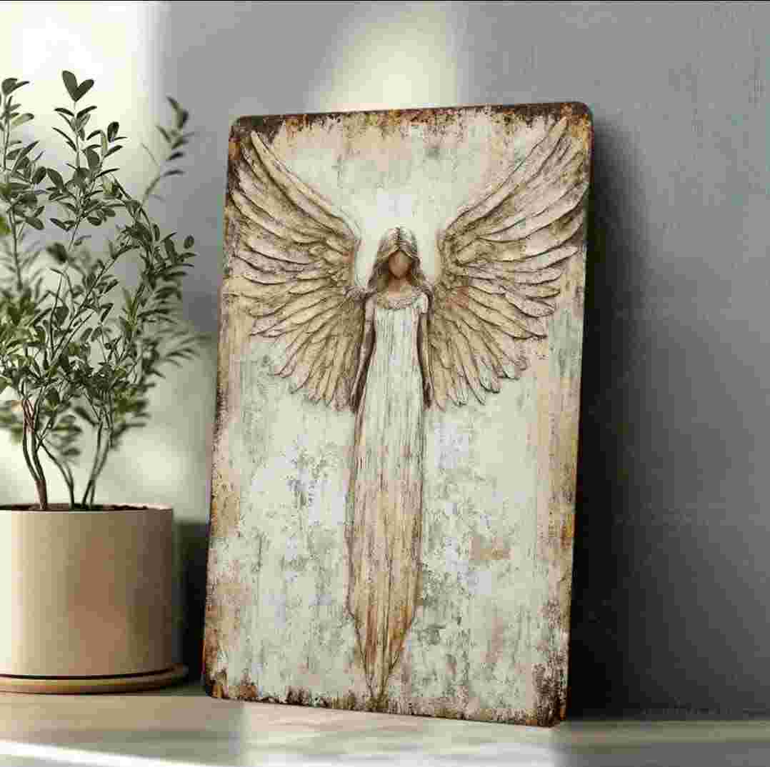 Ši Sargybinio Angelo metalinė sienos dekoracija – tai 2D plokščias, senamadiško (rustaikško) stiliaus kūrinys su angelu išskleistais sparnais. Šviesūs, švelniai sendinti tonai suteikia jaukumo, o pats angelo simbolis primena apsaugą, vidinę ramybę ir kryptį.