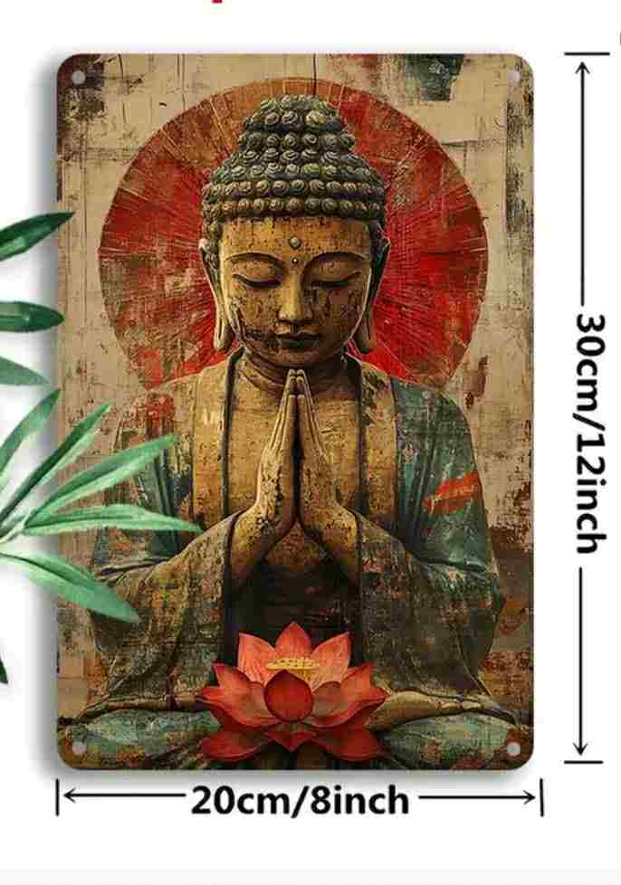 Ši senovinė Budos metalinė sienos dekoracija – tai estetiška zen įkvėpta plokštė su Budos atvaizdu, lotoso gėle ir rytietiškos simbolikos detalėmis. Sendintas, šiltų spalvų fonas kuria ramybės pojūtį ir suteikia erdvei meditacinę nuotaiką.